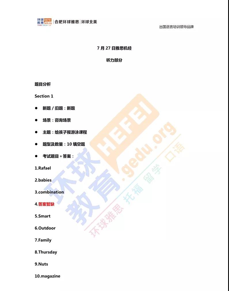 2019年7月27日雅思考试真题回忆+答案